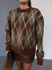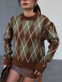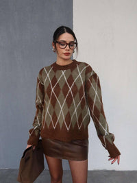 Add a retro-chic touch to your wardrobe with this cozy argyle knit sweater.