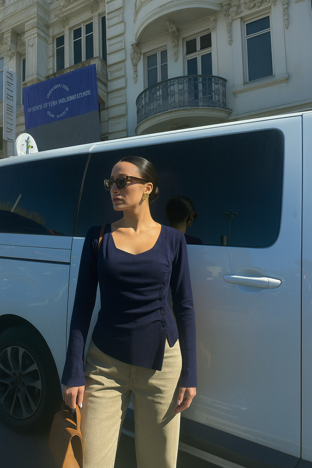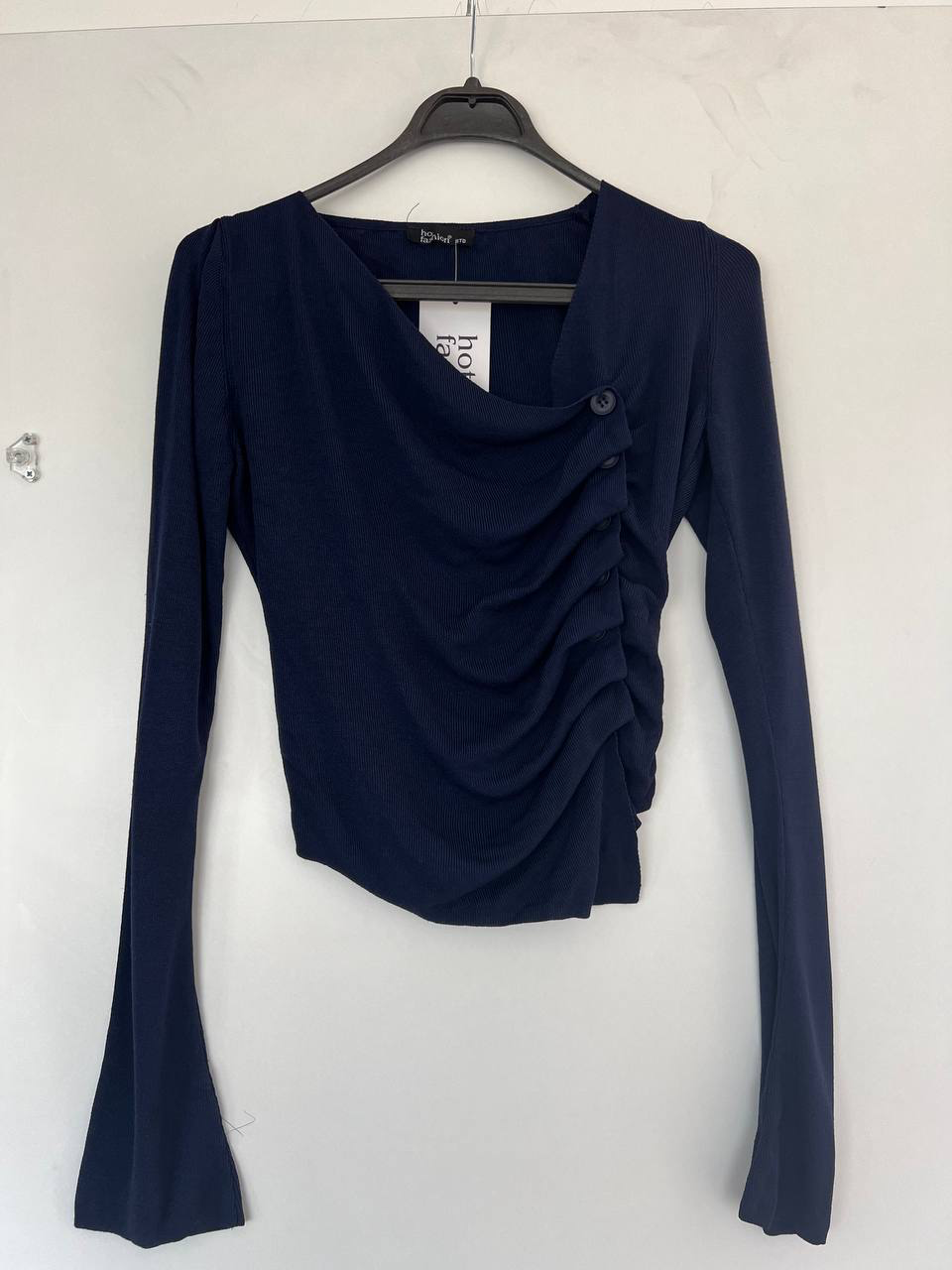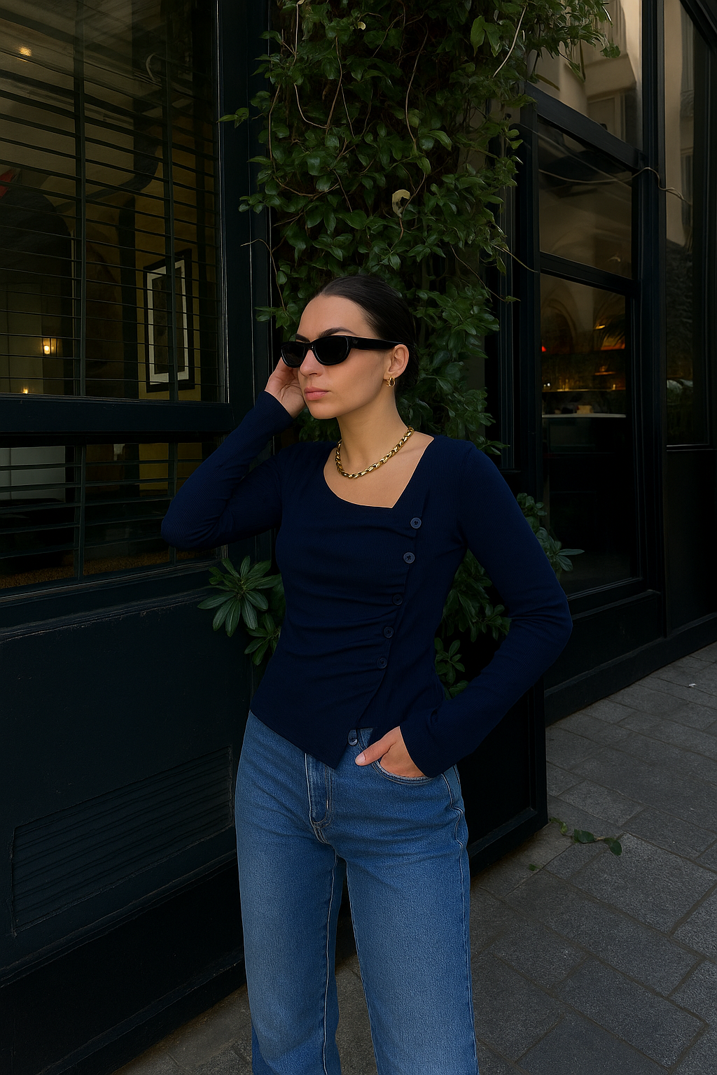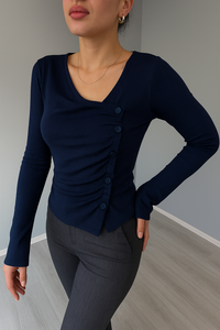 - Asymmetrical draped design with side buttons for a unique, modern touch.