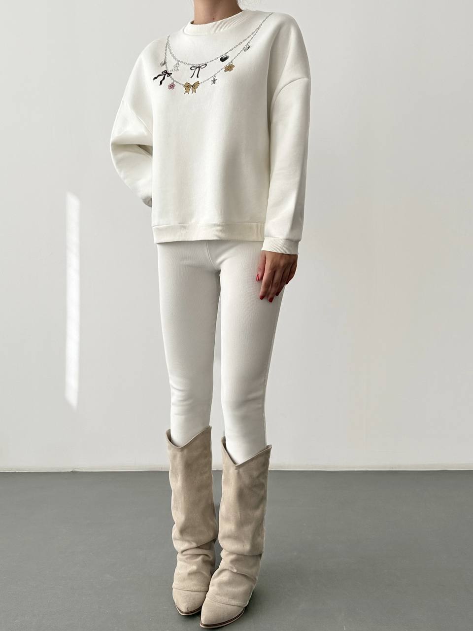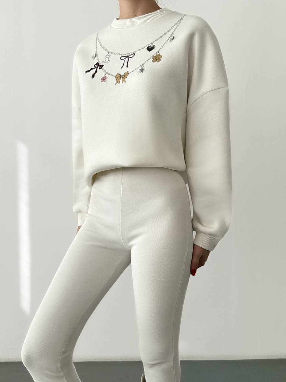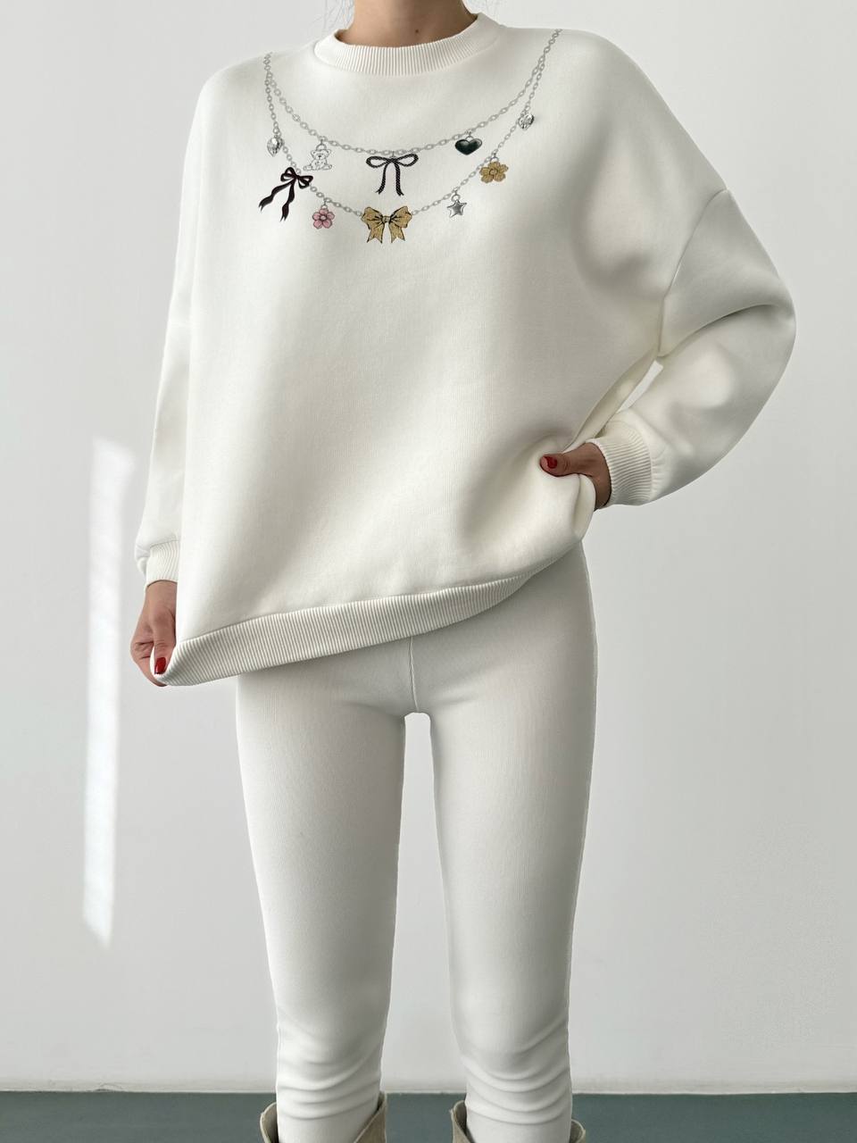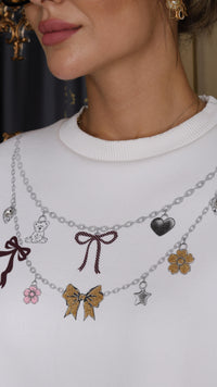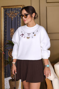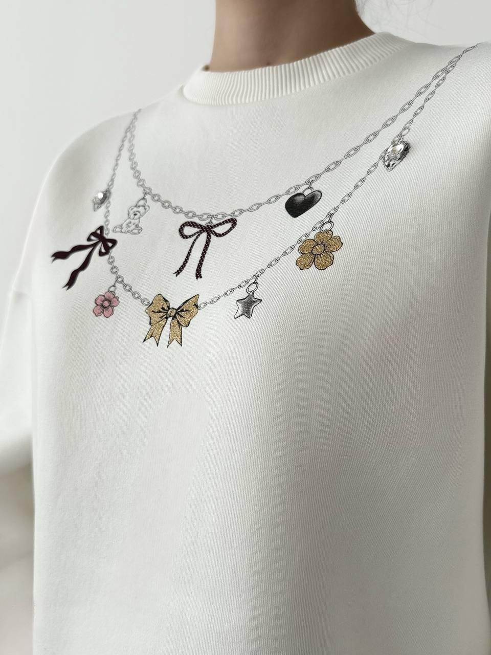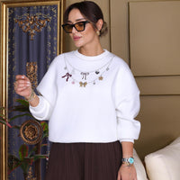 A soft oversized white sweatshirt featuring a unique necklace-style print with charms, bows, butterflies, and hearts. Casual yet chic, this sweatshirt adds a playful twist to your everyday look. Perfect to style with leggings, jeans, or joggers.