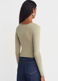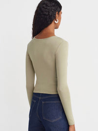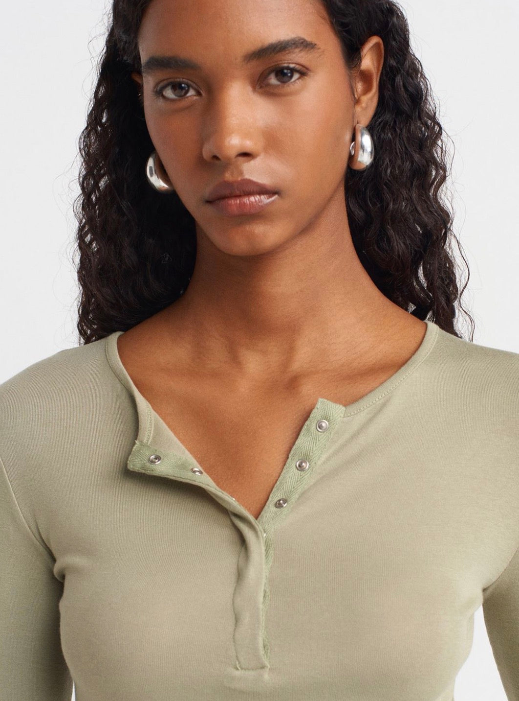 A fitted olive green henley top with long sleeves and a button-up neckline. Crafted from a soft stretch fabric for a flattering silhouette, this versatile piece is perfect for layering or styling on its own with jeans, skirts, or trousers.