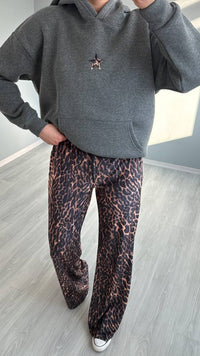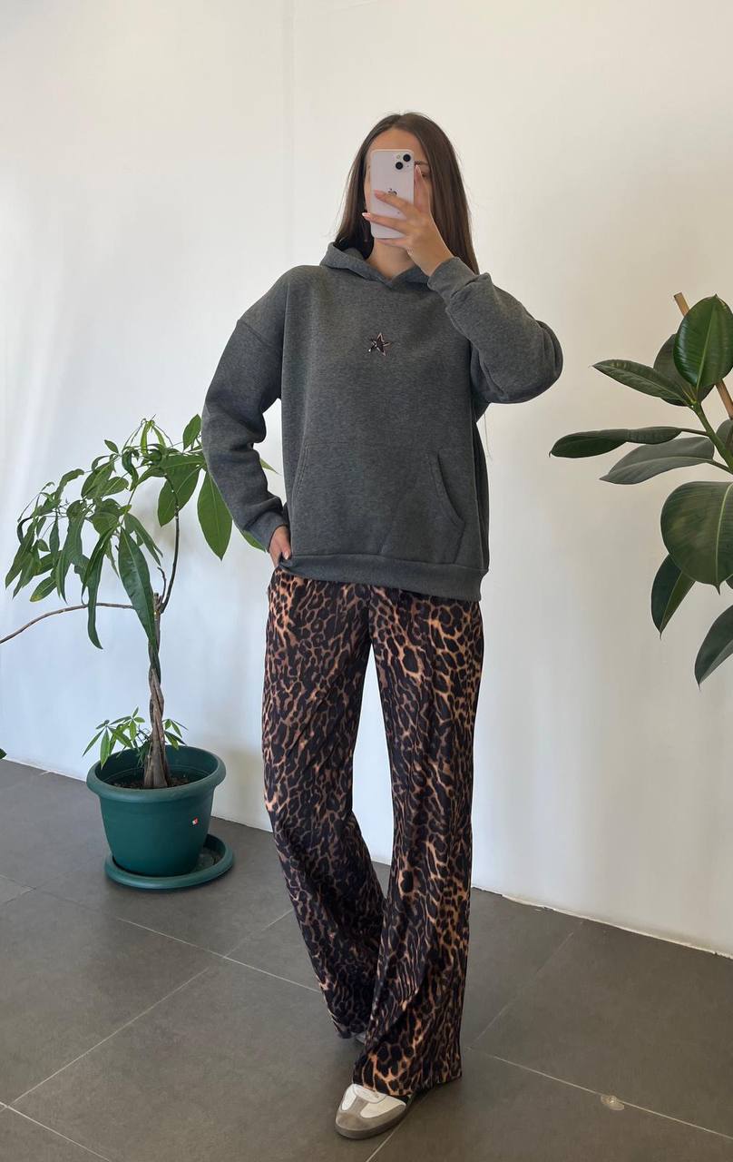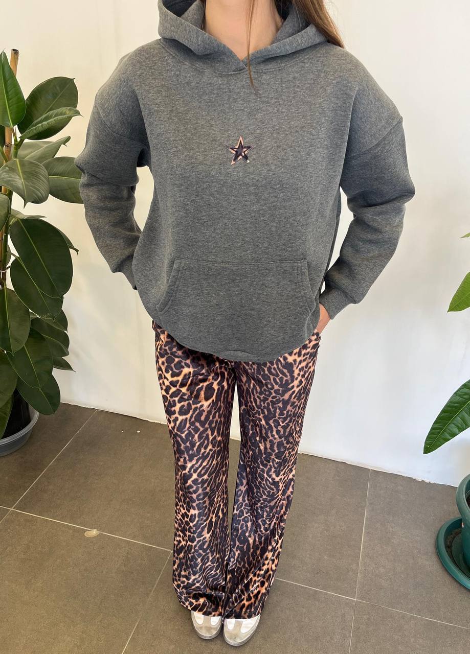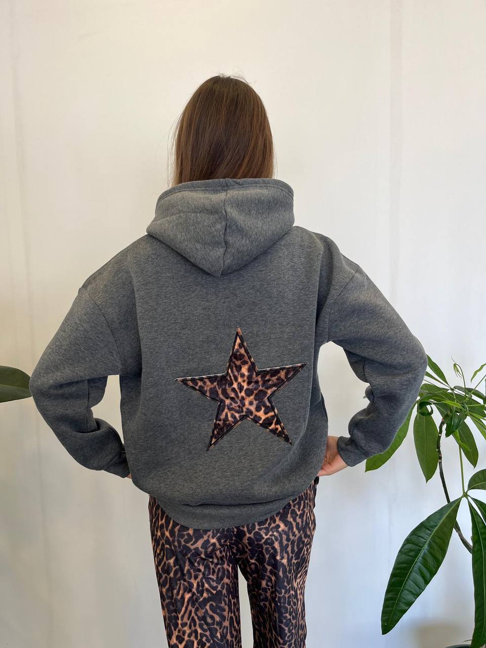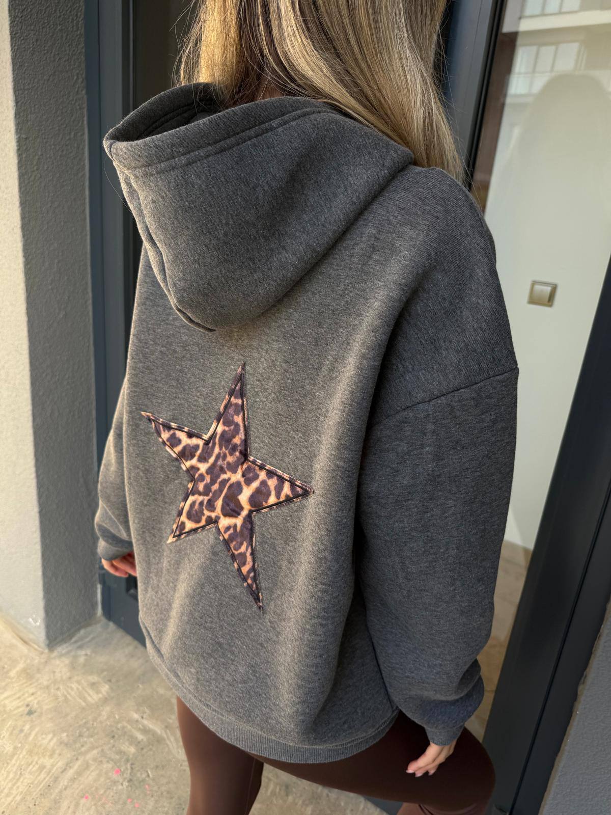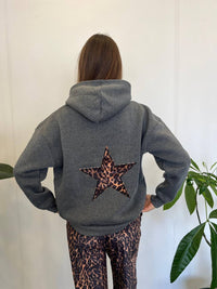 Make a bold statement with this cozy hoodie featuring a standout leopard-print star patch on the back.