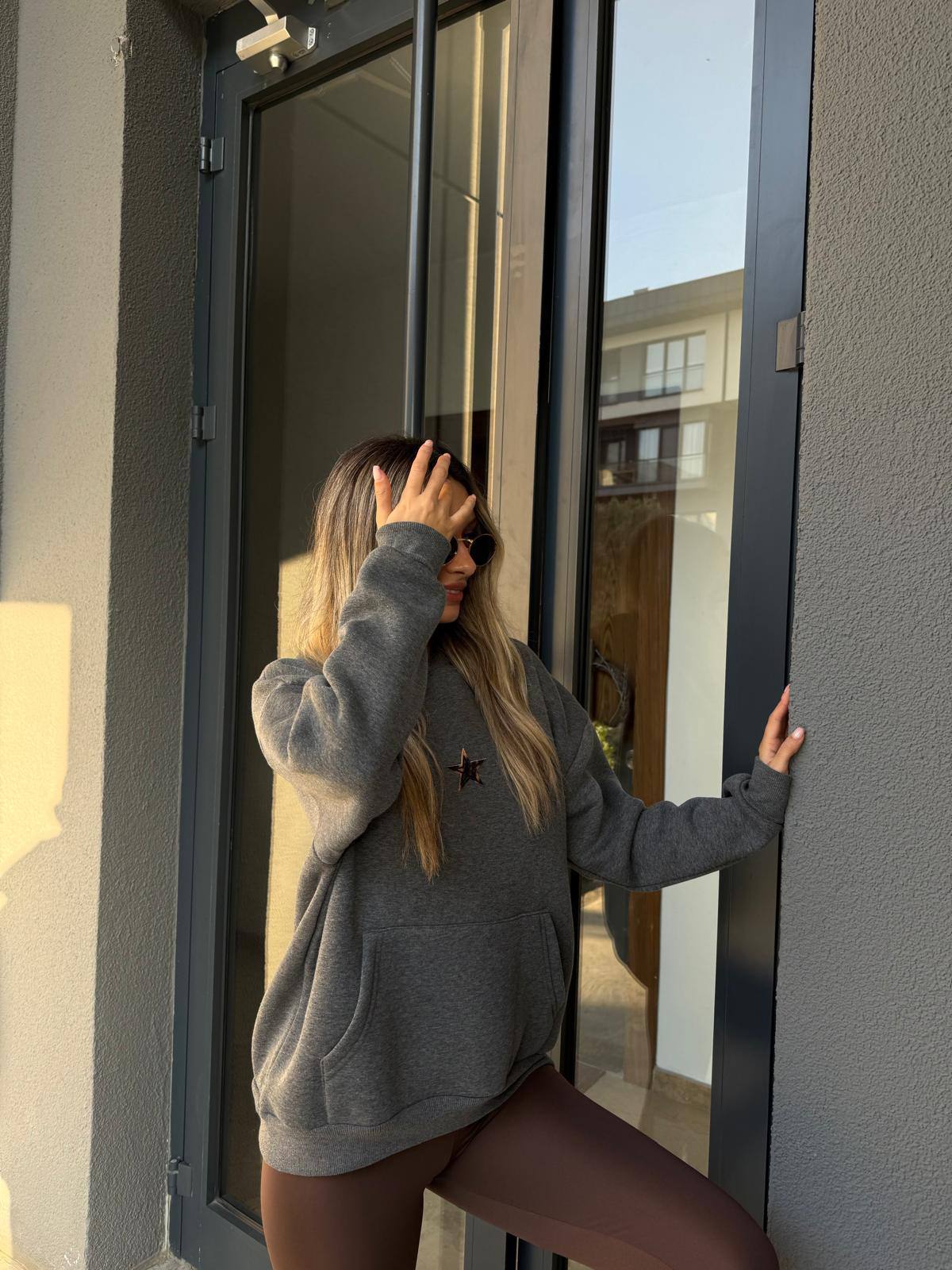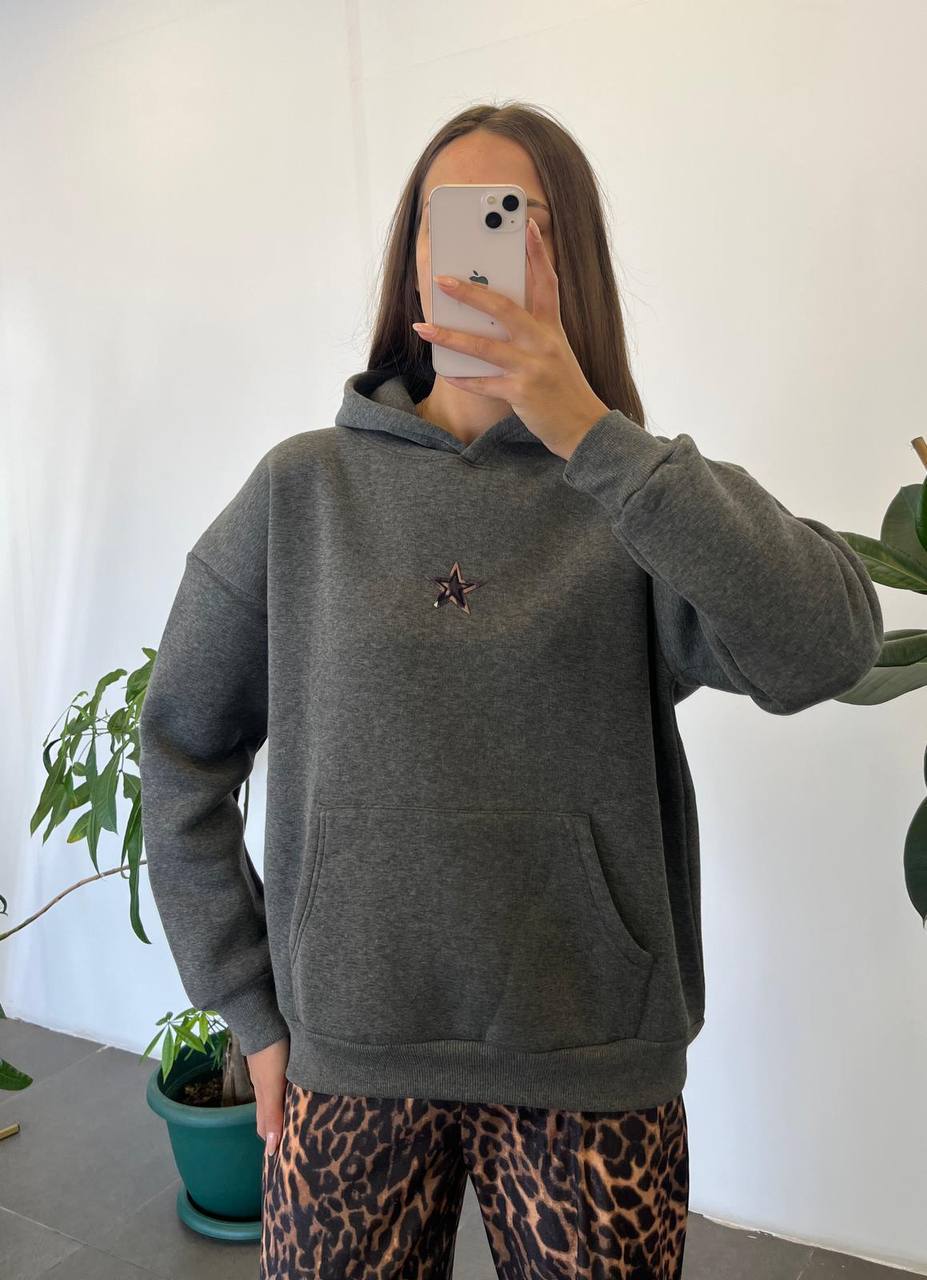 Crafted from soft cotton-blend fabric, it offers comfort and warmth while adding an edgy, trendy vibe to your everyday look. The charcoal grey color makes it easy to style, while the star detail brings a unique twist that sets it apart.